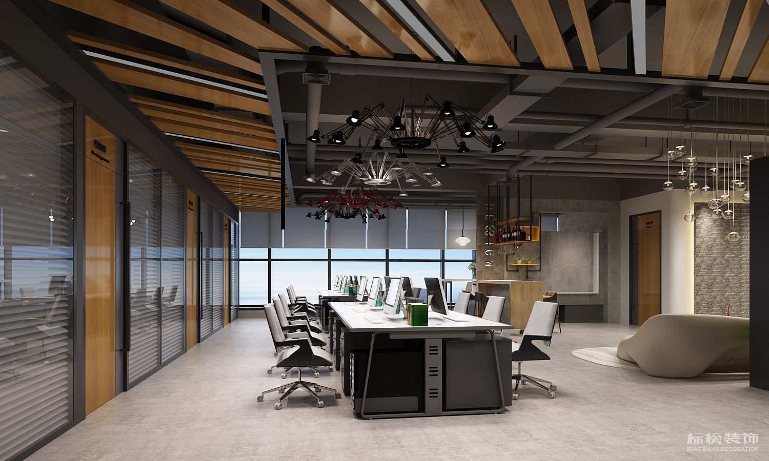 由于是辦公室的設(shè)計(jì),有些功能還是需要規(guī)劃的。空間小想要設(shè)計(jì)好,是有點(diǎn)難度的,其實(shí)這樣的設(shè)計(jì)可以很好的劃分功能區(qū),對(duì)辦公室沒(méi)有什么影響,就是采用了一些開(kāi)放式的設(shè)計(jì),隔墻設(shè)計(jì)或者落地窗設(shè)計(jì)。
